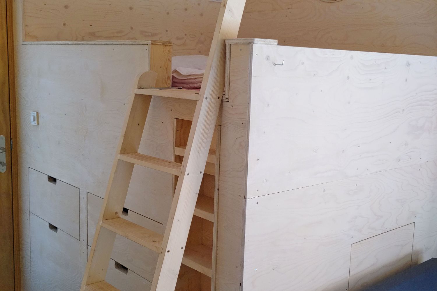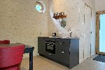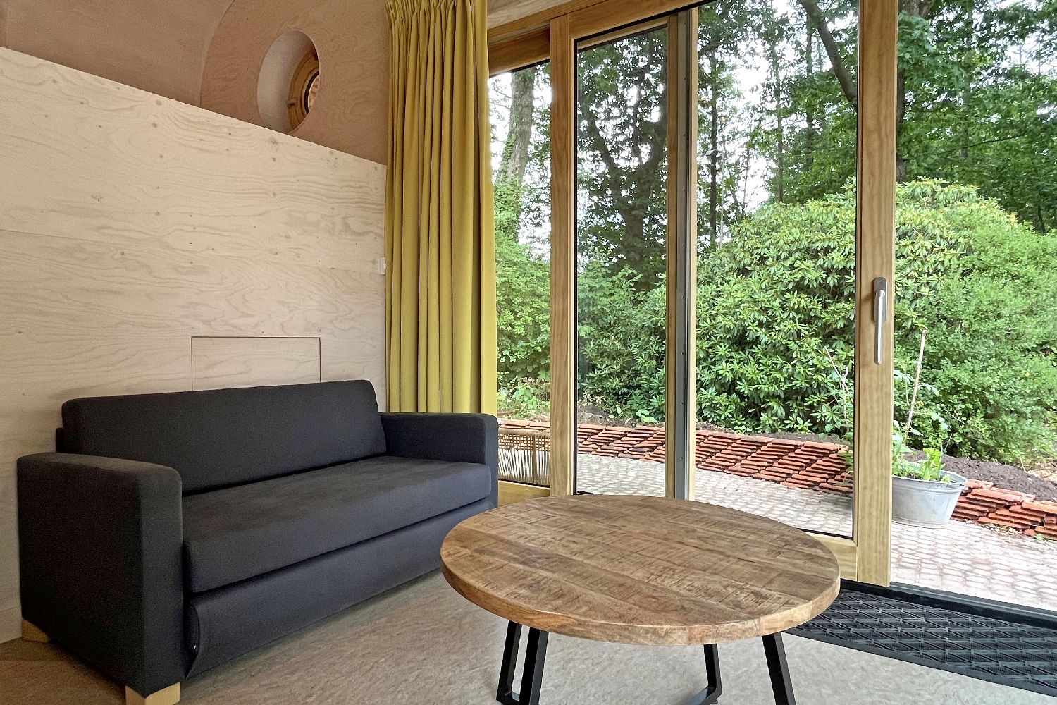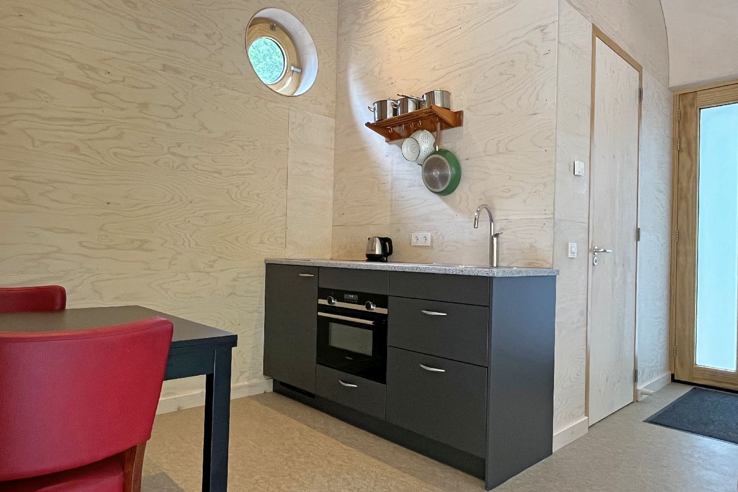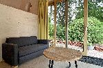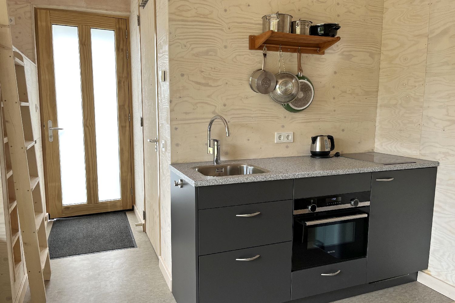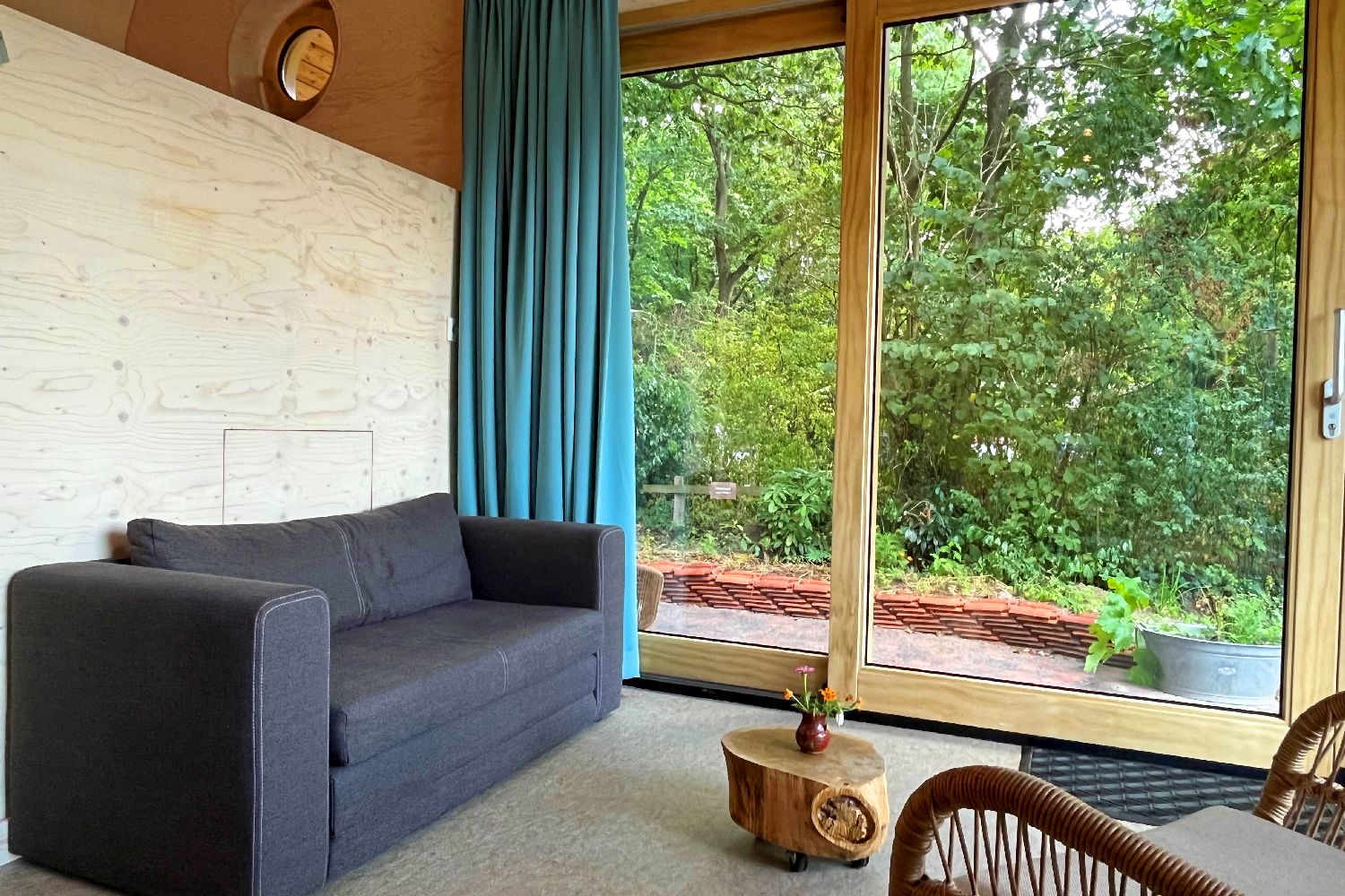 This specially designed 2-person Tiny House is floor heated and equipped with an attractive luxury bathroom with walk-in shower and toilet. You will sleep comfortably in a loft bed with a porthole, accessible by stairs. There is a dining area with a kitchenette with a 2-burner induction hob and a sitting area with a sofa bed and armchair. The windows and sliding doors provide light and you have access to your own covered terrace with hammock. The cottage is completely secluded with a view of the meadows of the De Roek petting zoo.