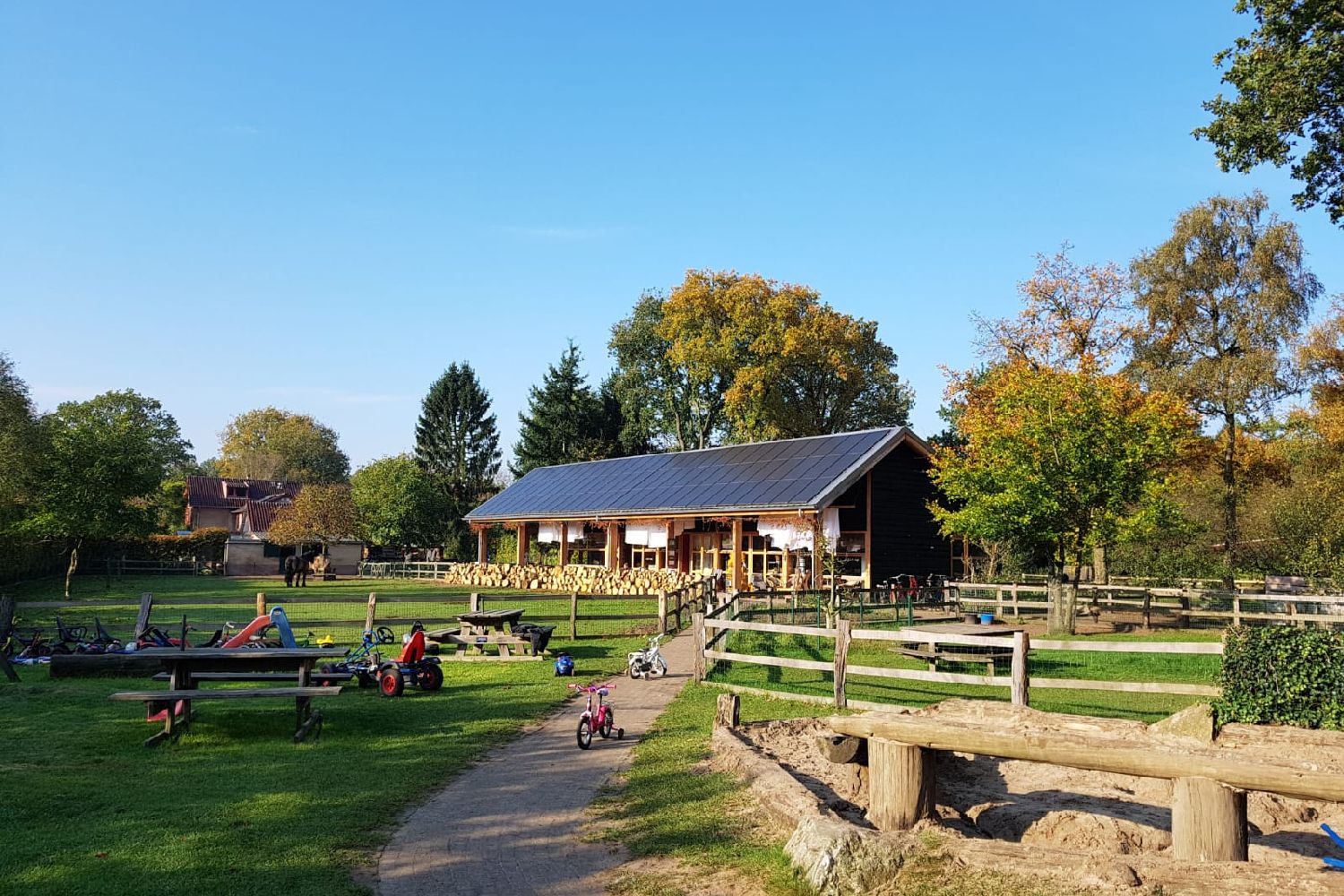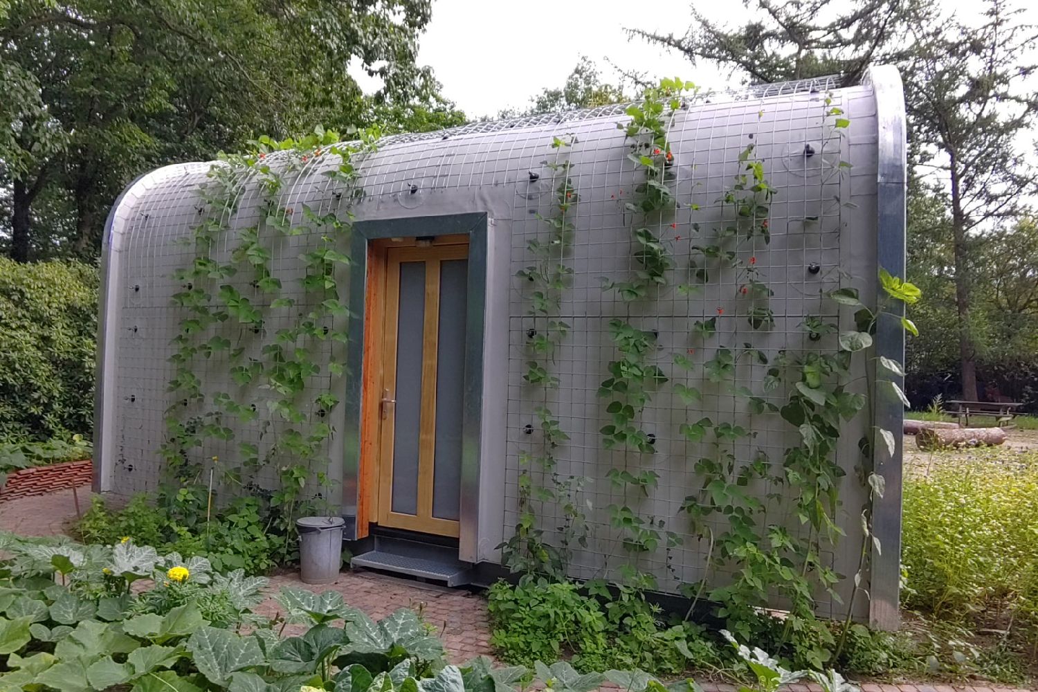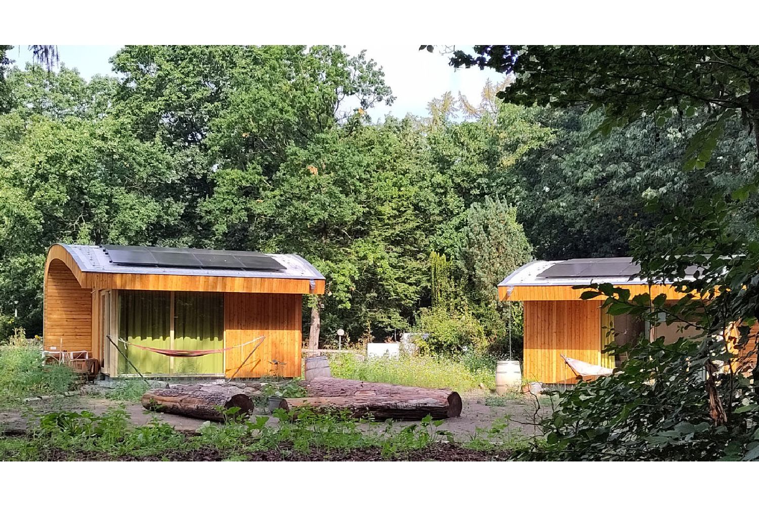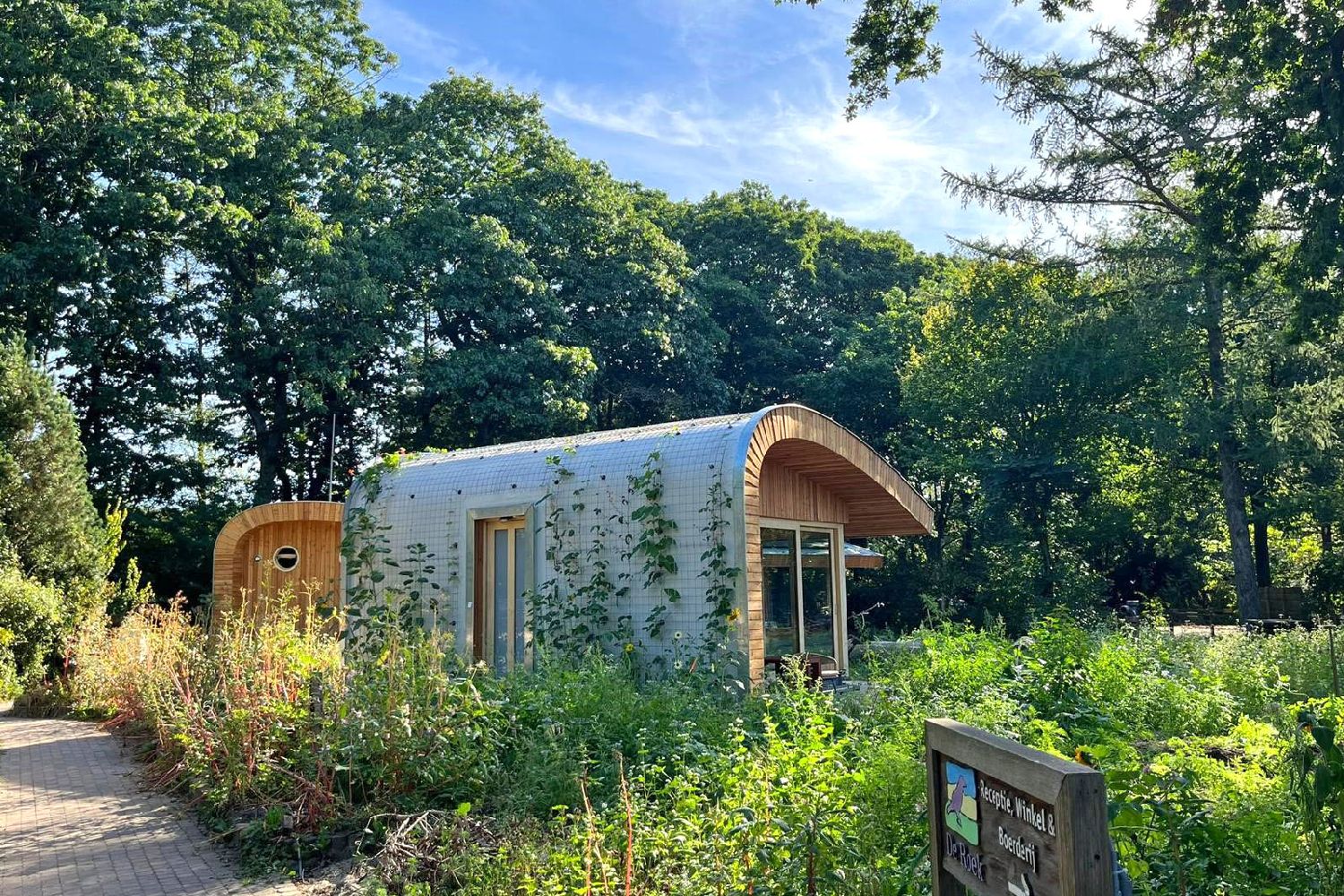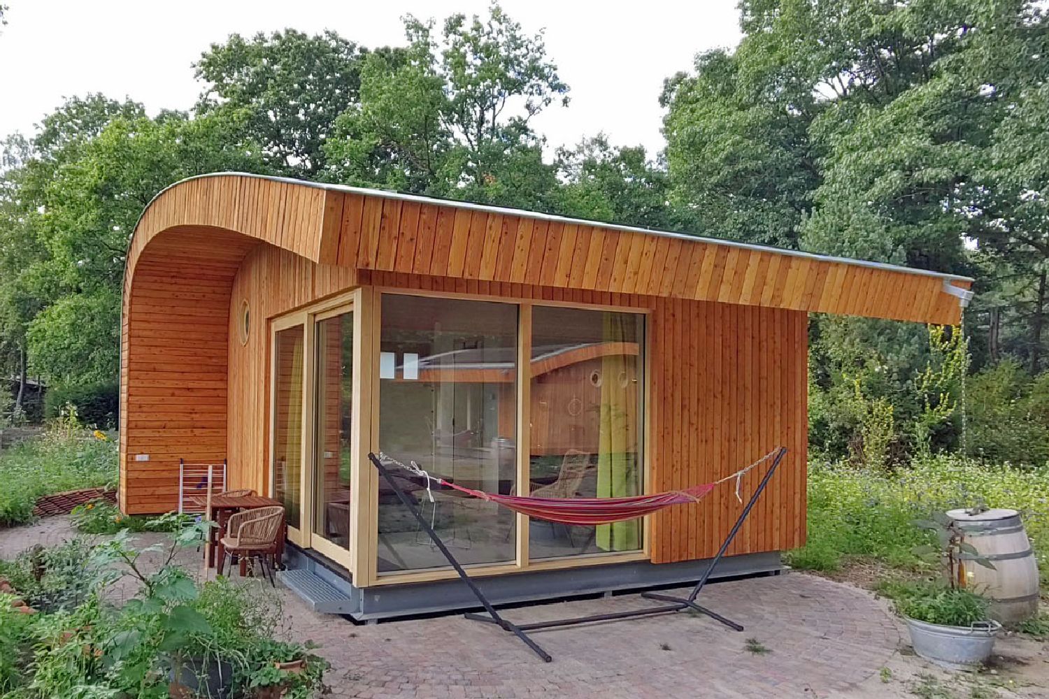Our special Tiny Houses, with covered terrace and hammock, are located directly on the migratory bird path just outside Otterlo in a food forest in the making, overlooking the farm of small-scale holiday park and care company De Roek.